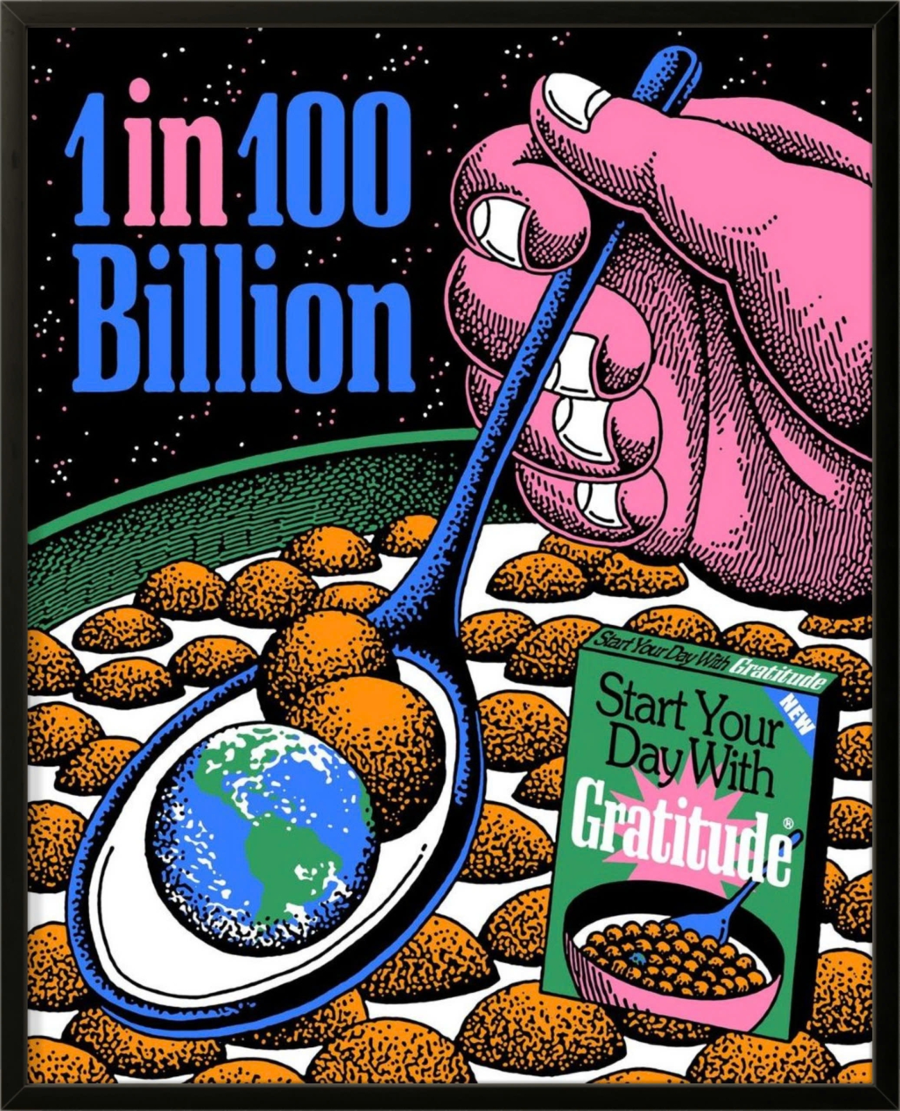 Poster 1 in 100 Billion – Start Your Day With Gratitude mang phong cách pop art – retro đặc trưng, kết hợp màu sắc tươi sáng và nét vẽ đậm chất minh họa cổ điển. Hình ảnh mô tả một chiếc thìa múc “trái đất” giữa vô số hạt ngũ cốc, đi kèm hộp cereal với dòng chữ Start Your Day With Gratitude. Tác phẩm vừa mang yếu tố hài hước, vừa truyền tải thông điệp sâu sắc về sự quý giá và độc nhất của mỗi cá nhân trong vũ trụ rộng lớn.