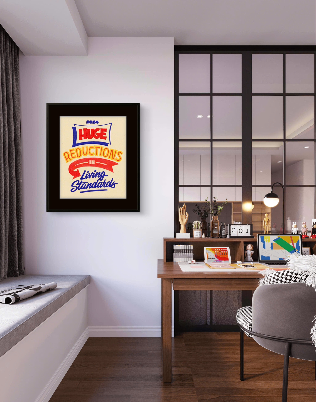Đây không chỉ là một bức poster trang trí mà còn giống như một tác phẩm nghệ thuật đương đại với sự mỉa mai tinh tế. Nó sẽ trở thành điểm nhấn nổi bật khi treo trong phòng khách, quán cà phê, studio sáng tạo hoặc không gian làm việc nghệ thuật.