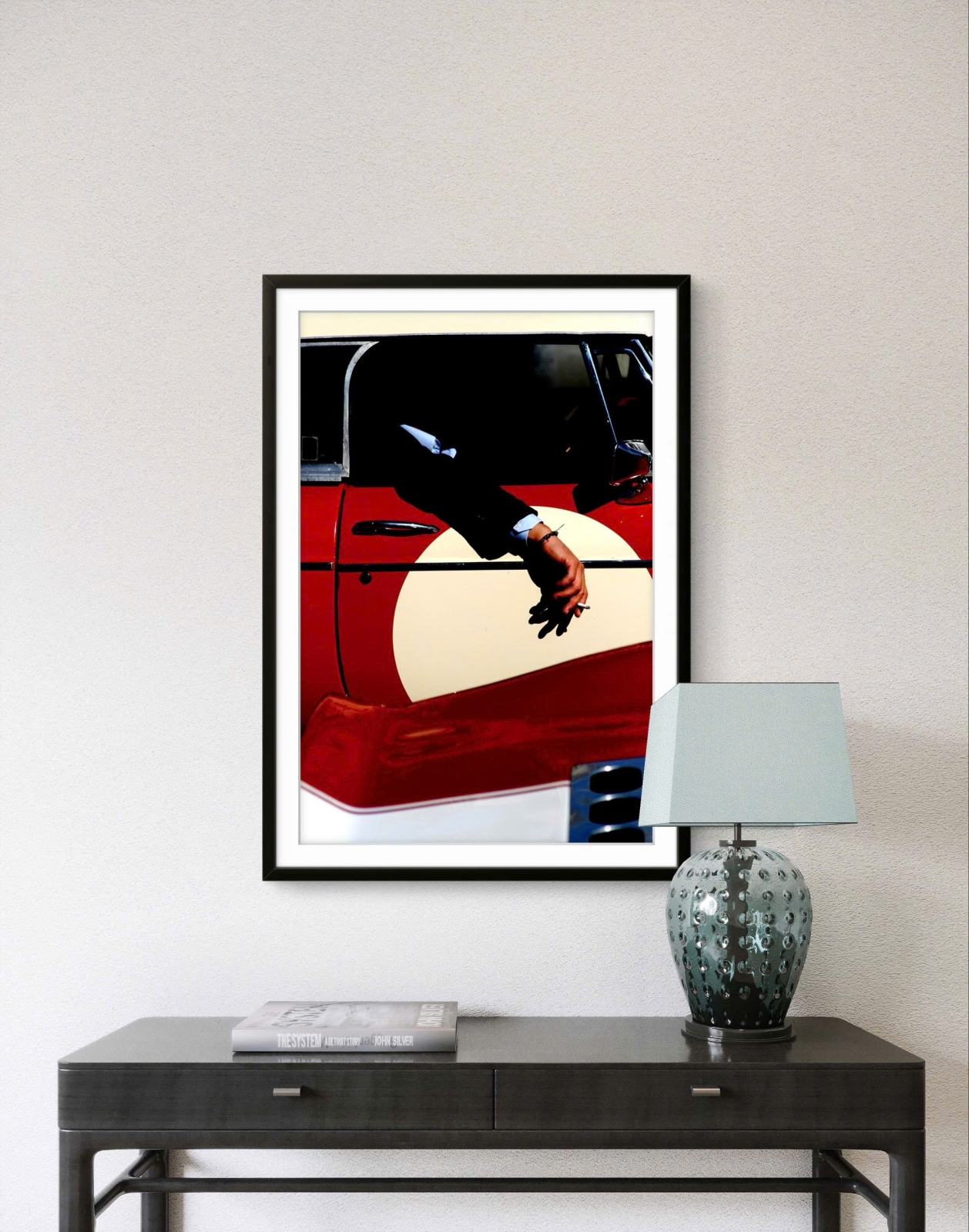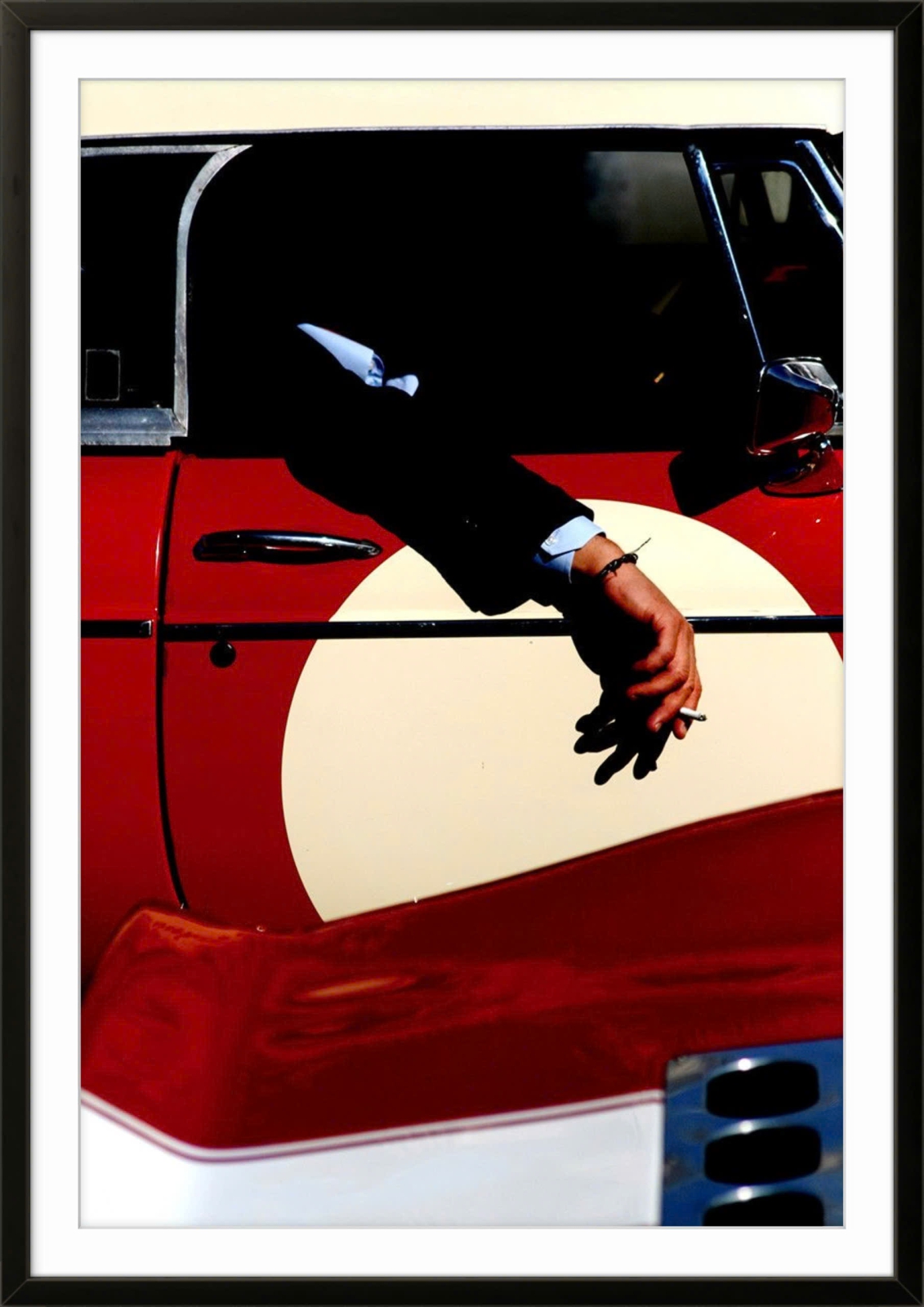 Nổi bật là cánh tay của một người đàn ông mặc vest thò ra từ cửa sổ xe cổ màu đỏ - trắng, trên tay cầm điếu thuốc. Tông màu đỏ rực rỡ kết hợp với chi tiết ánh sáng – bóng tối mạnh mẽ tạo nên một khung cảnh vừa phóng khoáng, vừa gợi cảm giác “cool” và nổi loạn.