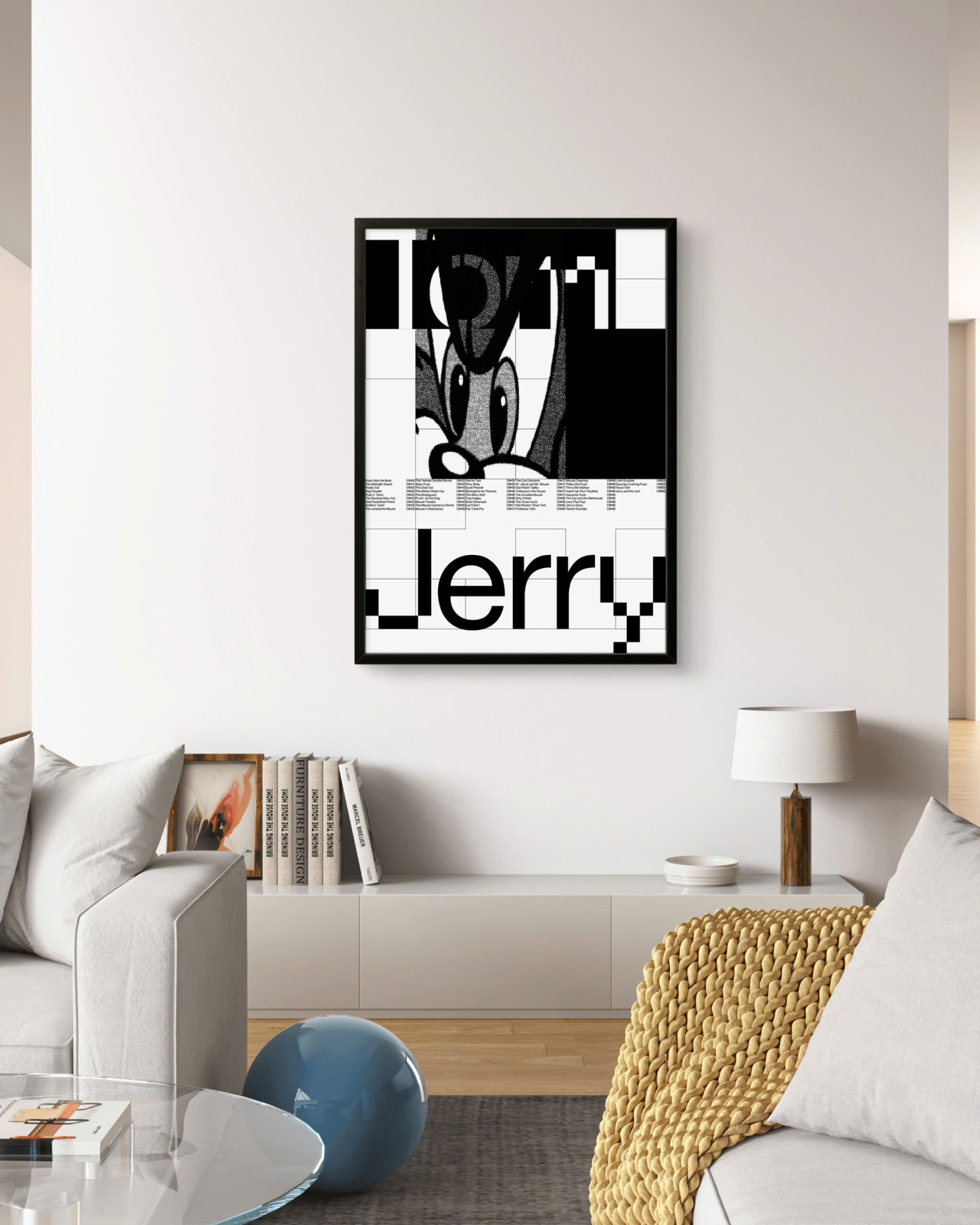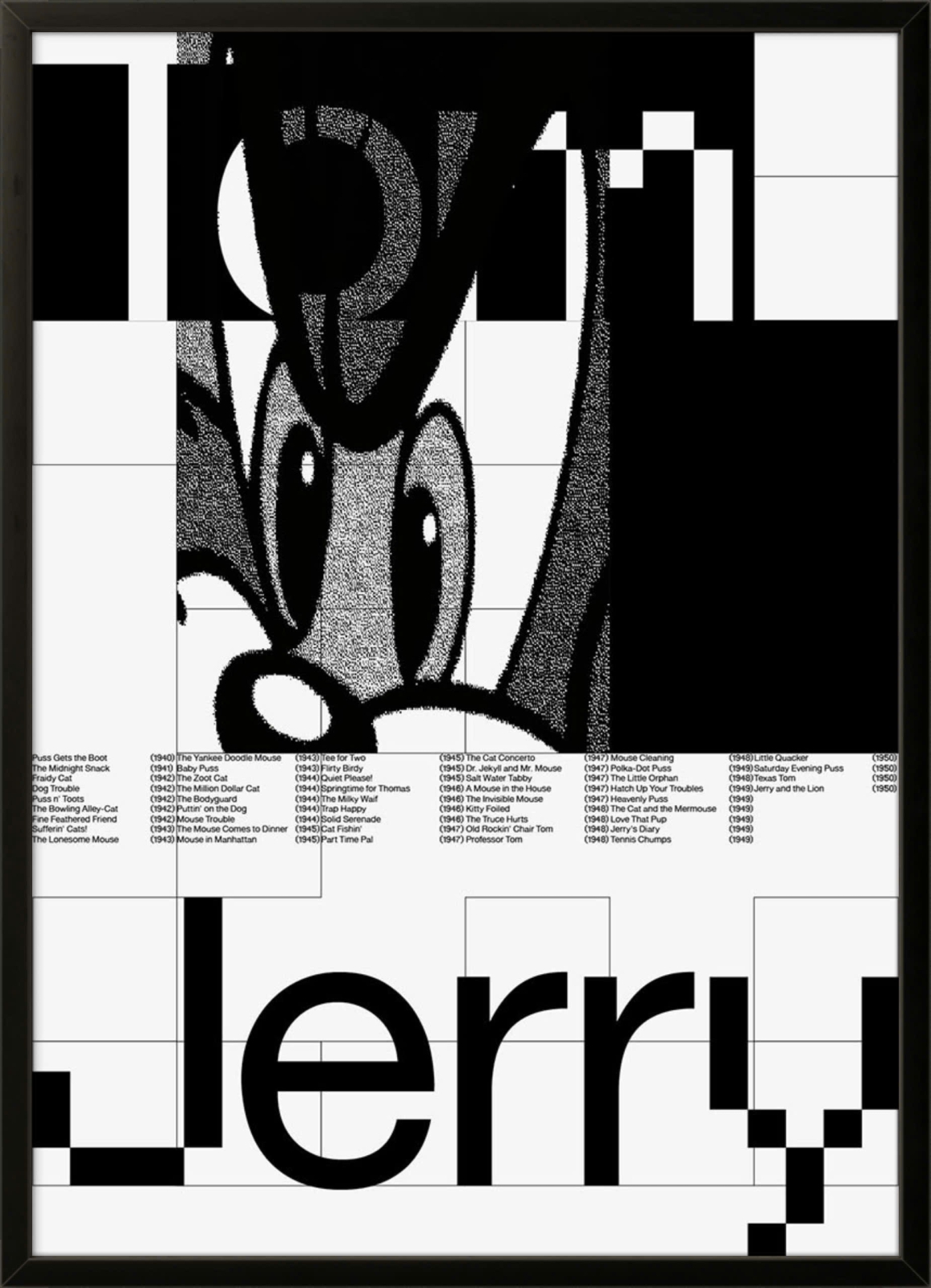 Điểm nhấn thú vị nằm ở phần chữ “Jerry” và danh sách các tập phim kinh điển trải dài từ những năm 1940–1950, gợi nhớ tuổi thơ của hàng triệu khán giả trên khắp thế giới. Đây là một tác phẩm vừa mang giá trị hoài niệm, vừa phù hợp với những không gian mang hơi hướng minimalist hoặc retro hiện đại.